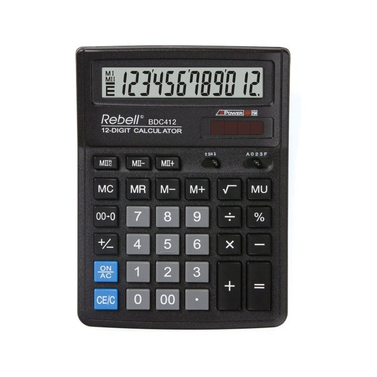 Rebell SDC 412 je kompaktni 12-cifreni stolni kalkulator koji se napaja i solarnom energijom i baterijama, s ugrađenim funkcijama za izračun: