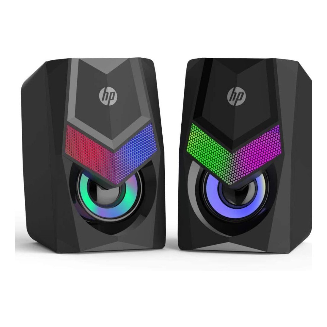 HP DHE-6000 je žični, kompaktni 2.0-kanalni stereo sistem sa dinamičkim RGB pozadinskim osvjetljenjem. Set se povezuje preko 3.5 mm audio priključka za zvuk i USB-A porta za napajanje