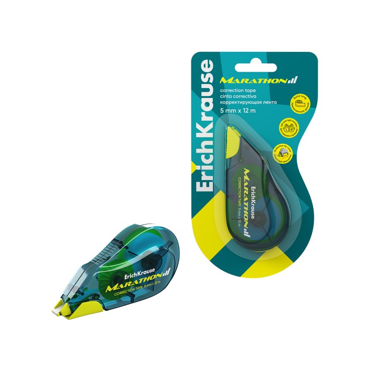 Erich Krause Marathon korekcijska traka u akvamarin boji je korektorska traka velikog kapaciteta namijenjena za upotrebu kod kuće ili u kancelarijskom okruženju. Posebnost ove korektorske trake je njena dužina, koja je prilično veća od tipičnih korektorskih traka u džepu