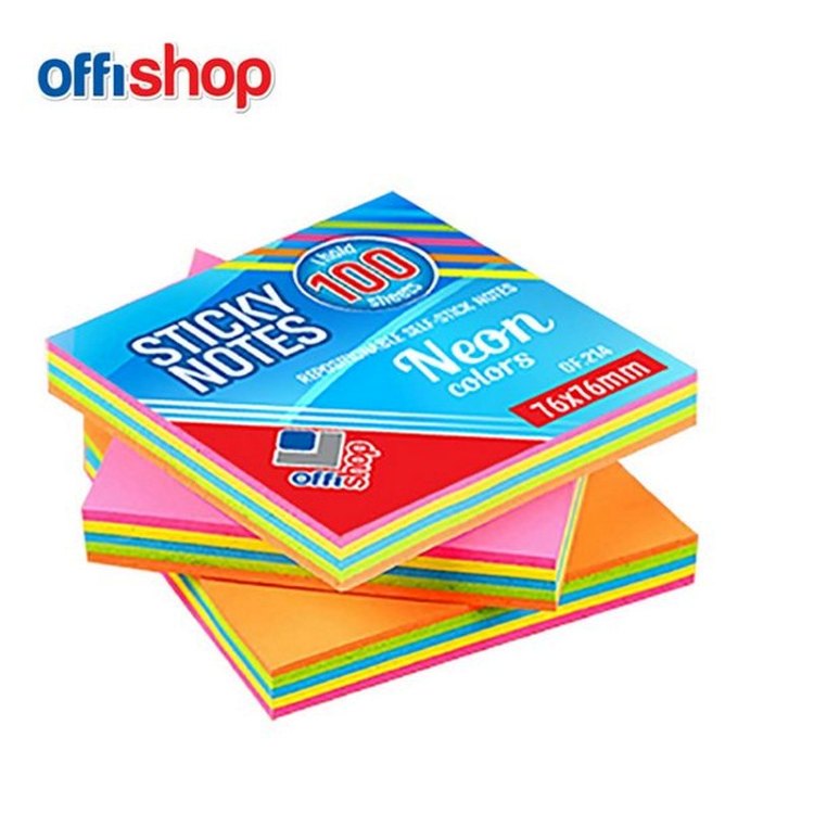 Samoljepljivi Blok Neon Miks 100 Lista OF214 je kvadratni samoljepljivi blok za bilješke sa mješavinom visoko vidljivih neonskih boja. Namijenjen je za brzo kreiranje bilješki, podsjetnika i obilježavanje dokumenata